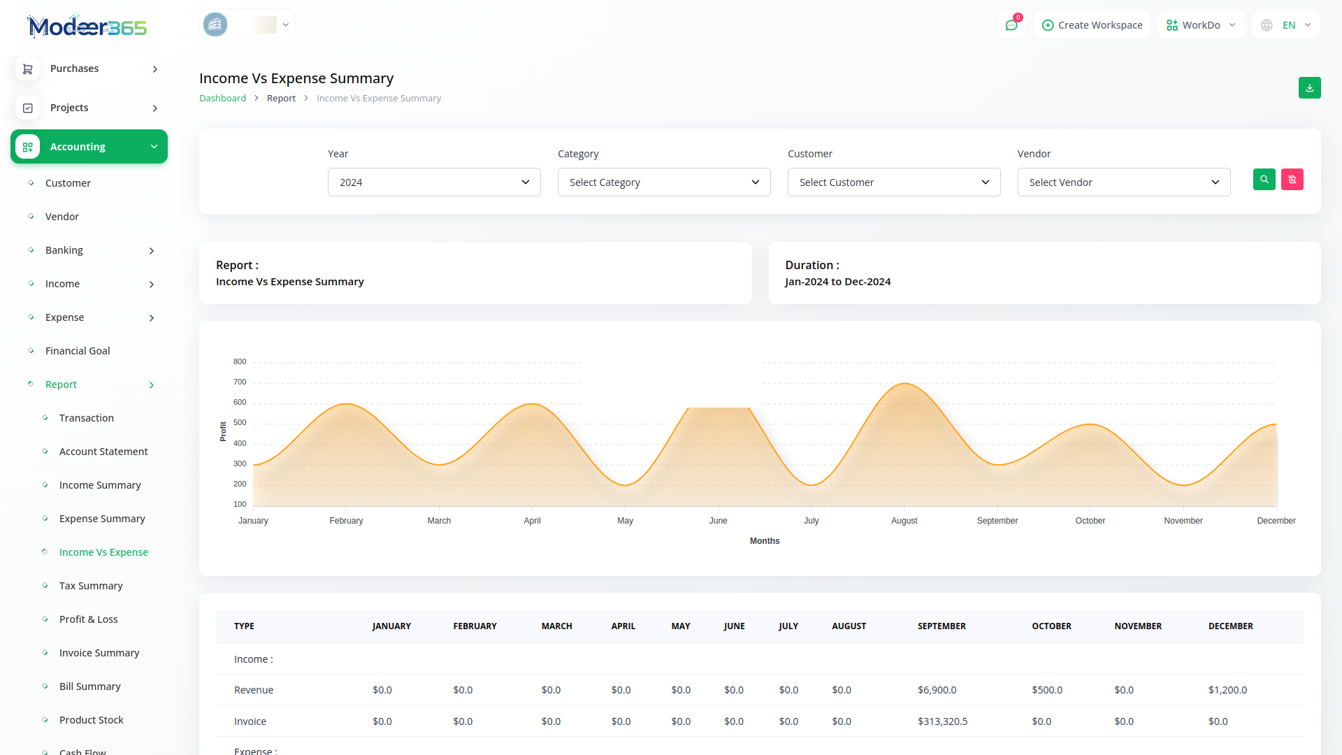 Get a report on transactions with an easy filtering option. Download the required account statements in either PDF, CSV, or Excel format. You get duly prepared reports on individual Income, Expenses, Tax, Invoice, and bill summary. Filter them based on Account, category, and customers. Also, a graphical display of the Income VS Expense chart along with a detailed calculation of Profit and Loss will help you make informed decisions. Filter the tax summary and Income VS Expense chart based on financial years.