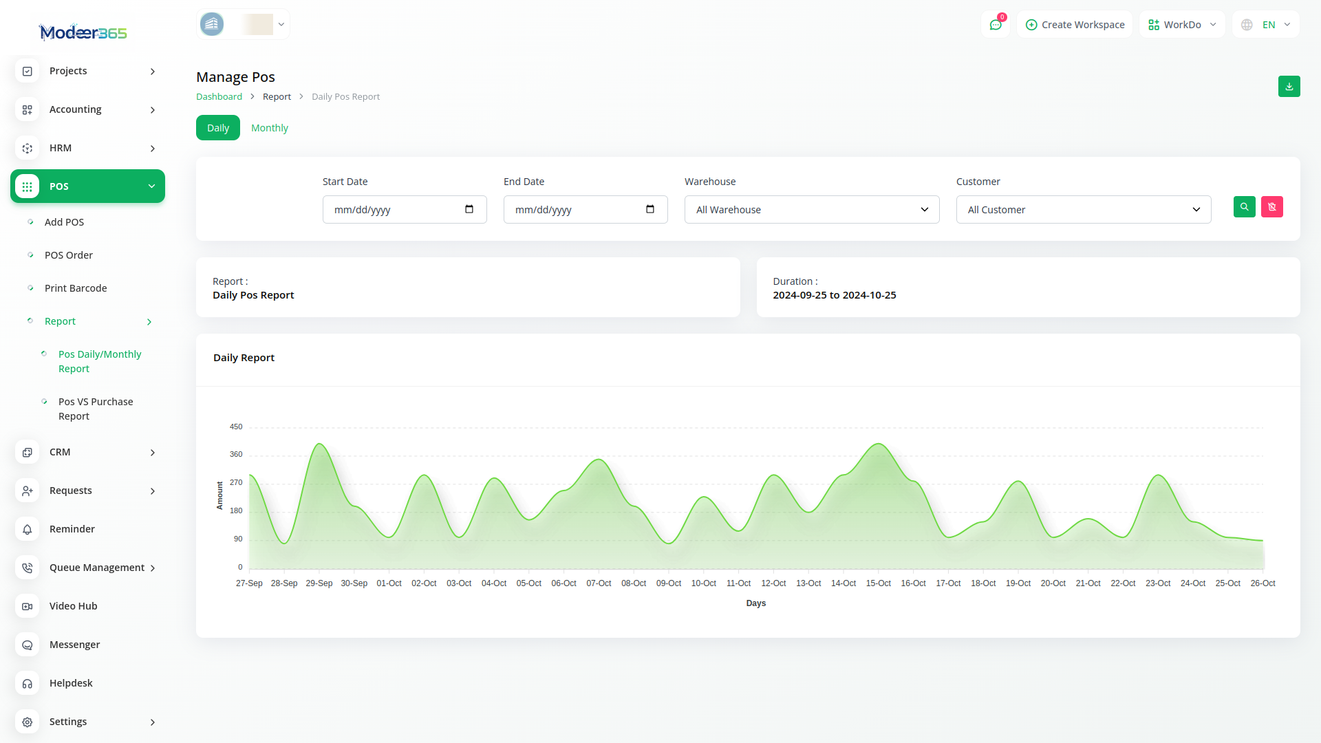 Welcome to the POS Module in Modeer365, your ultimate solution for streamlined sales management. Our platform offers a user-friendly dashboard where you can easily navigate through your sales activities. At the heart of the dashboard is a dynamic chart representing your sales reports, providing valuable insights into your business is performance. Whether you are a small retail store or a bustling restaurant, our POS Module empowers you to efficiently manage your sales process from start to finish.